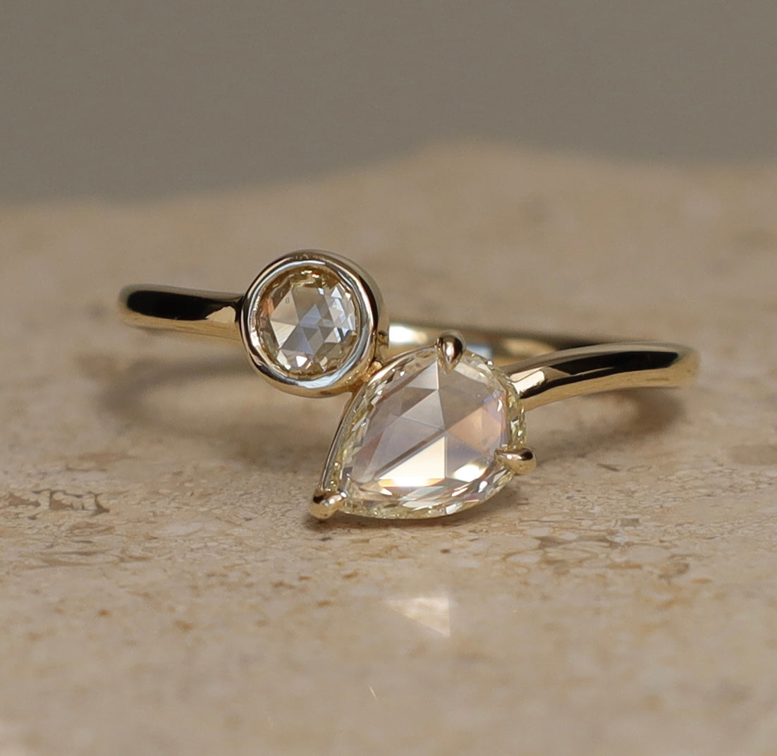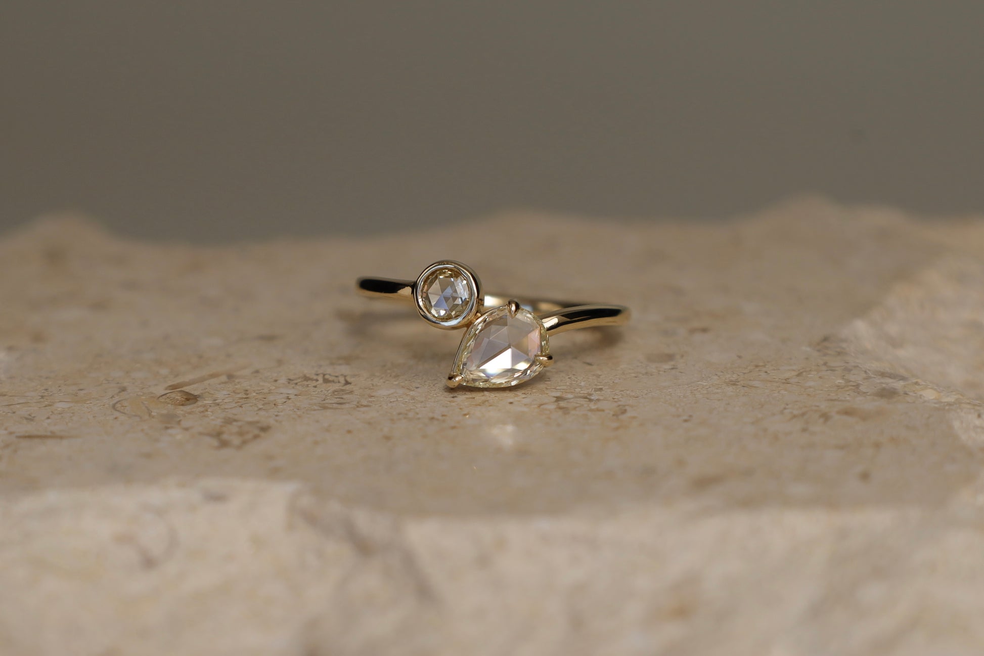 - Stone: Rose Cut Yellow Pear and Round Shape Diamond =.45cts & =.18cts
